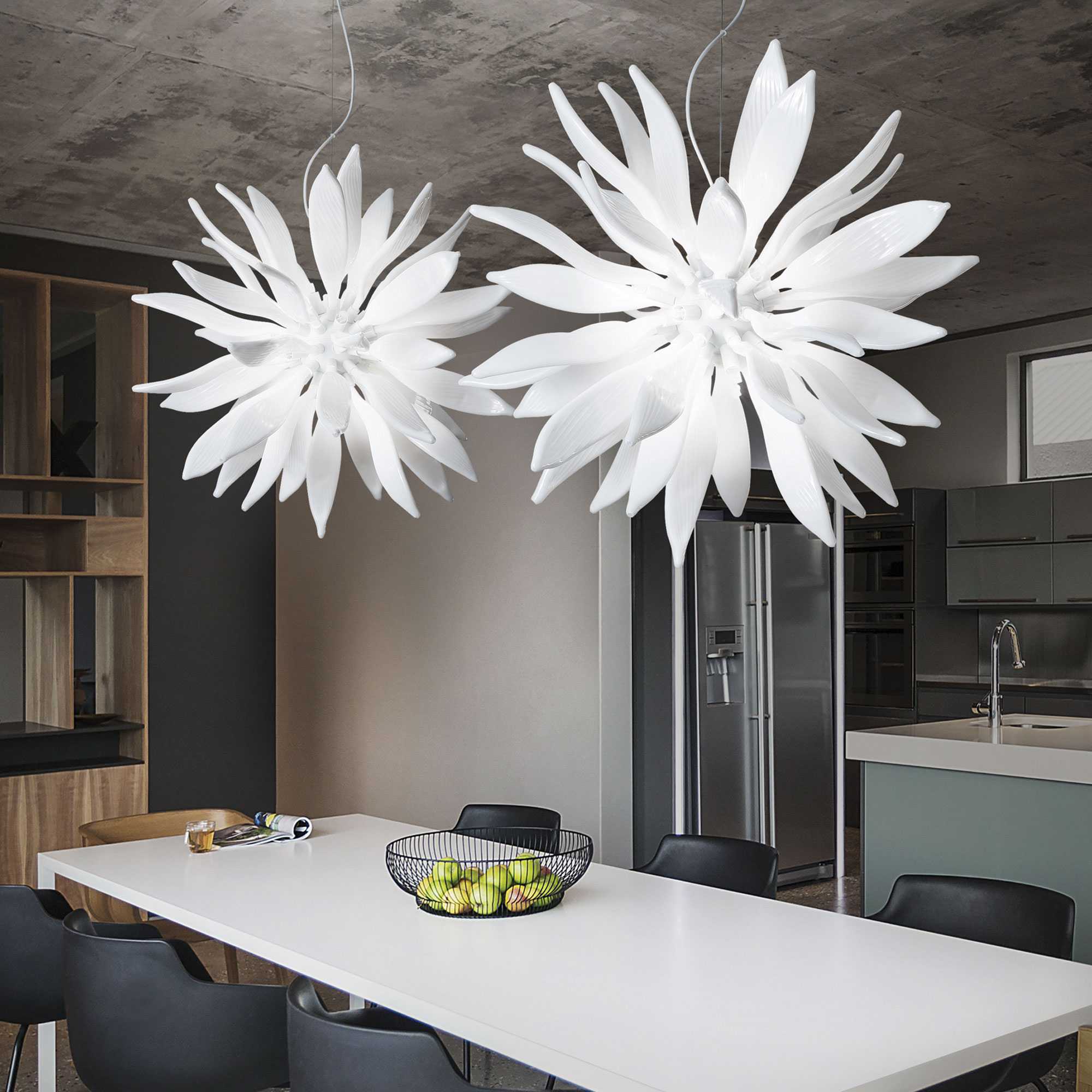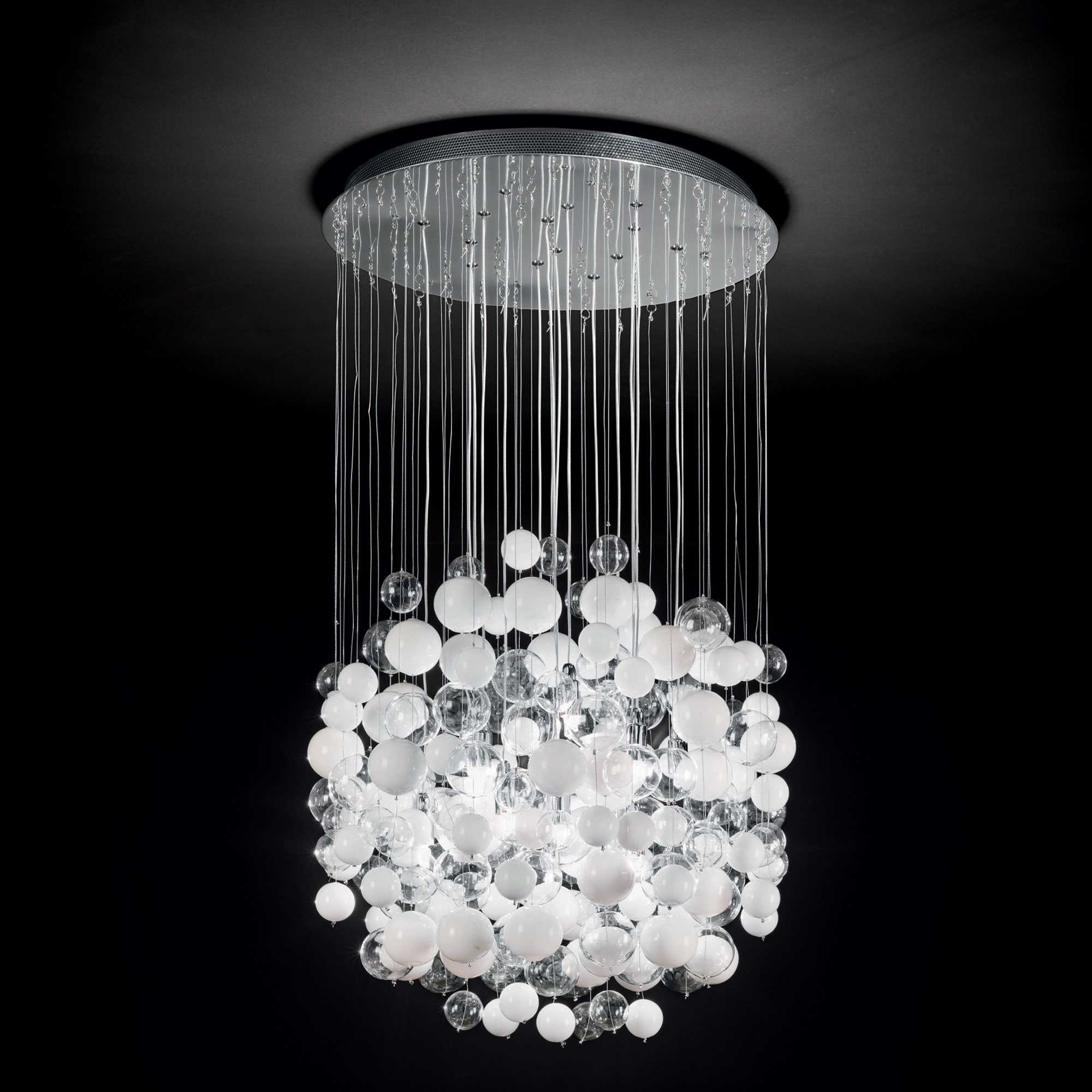 L105xH min 35/max 110 x P 54 cm, E27 max 5 x 60W Chrome or white metal frame. White acidetched blown glass diffuser with spherical shape and painted decoration or clear chrome glass with downward nuance.